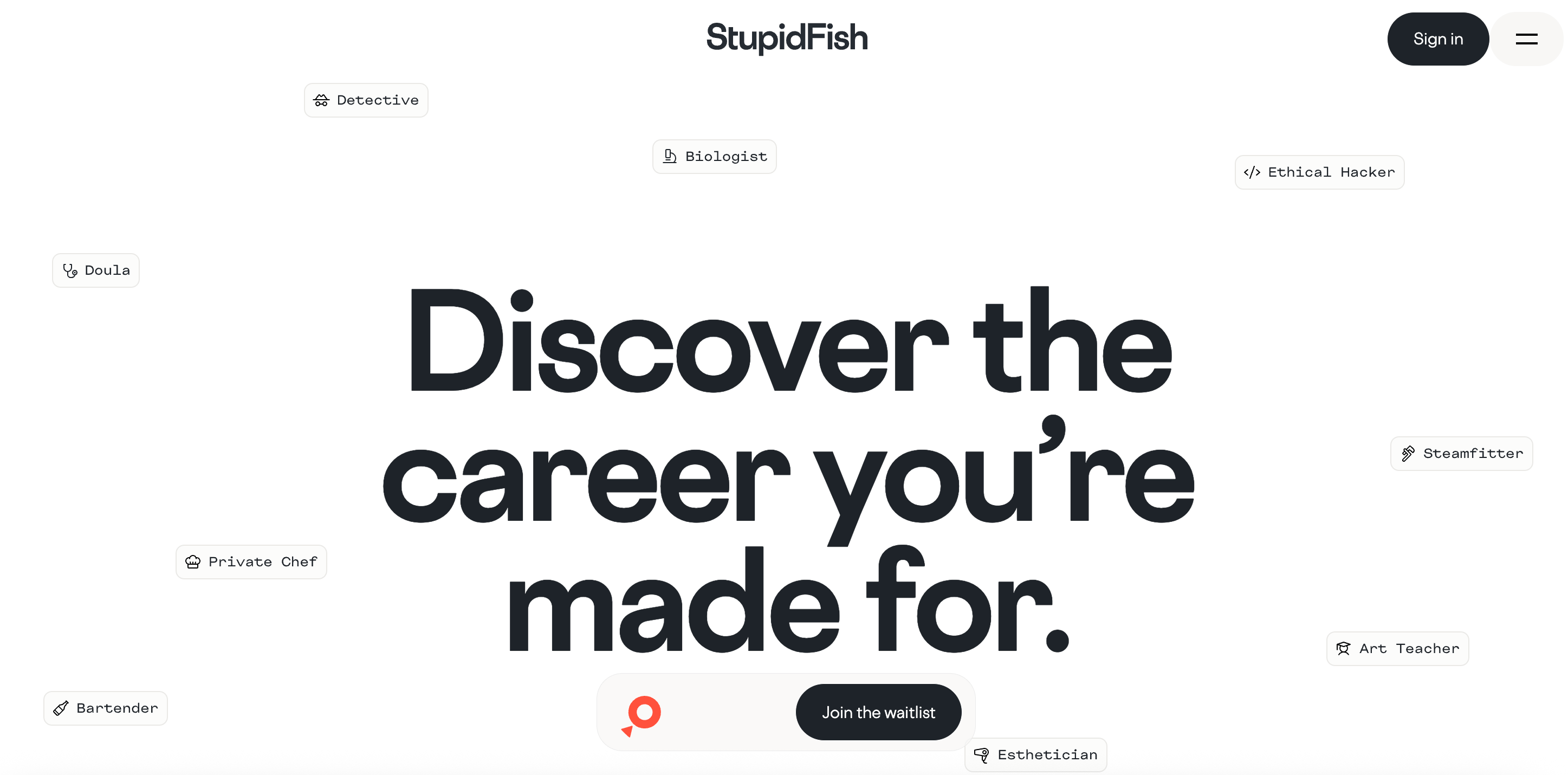 And then she did something that Person A could never do on day one: she launched a venture-backed tech startup called StupidFish — "the cure for career confusion."